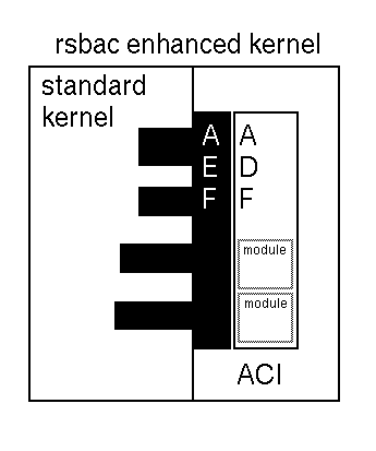 Binnen dit blok bevindt zich de functionaliteit die zorgdraagt voor alle (interne) RSBAC administratie, waaronder locking informatie en linked lists in kernelgeheugen. Communicatie tussen de AEF en ADF vindt deels plaats via hier opgeslagen data. Hier worden de regels bewaard die de beveiligingsstrategieen definieren. Hier wordt ook de status tussen de diverse aanroepen bijgehouden. In het figuur is de ACI als een onderdeel van de kernel getekend. De ACI bevat echter ook, indien geconfigureerd, een koppeling met speciale directories per filesystem (die de naam 'rsbac' krijgen, dus bijvoorbeeld /rsbac, /var/rsbac etc.), waarin de kernellijsten zonodig door de kerneldaemon worden weggeschreven, om er bijvoorbeeld voor te kunnen zorgen dat na een reboot de meest actuele stand van zaken terug kan worden gezet.